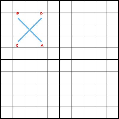 Bring the needle up at A, move up and to the left two canvas intersections, bring the needle down at B. Bring the needle up at C, move up and to the right two canvas intersections, bring the needle down at D. Now, continue on to Diagram 2...