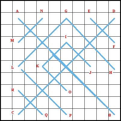 Beginning where we left of at N, bring the needle up at O, move up and to the left two canvas intersections, bring the needle down at K. Bring the needle up at P, move up and to the left four canvas intersections, bring the needle down at L. Bring the needle up at Q, move up and to the left two canvas intersections, bring the needle down at R. Now, continue on to Diagram 5...