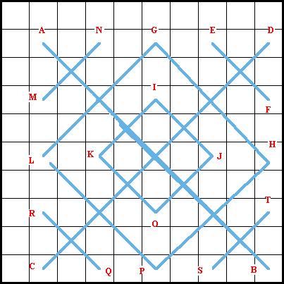 Beginning where we left of at J, bring the needle up at K, move up and to the right two canvas intersections, bring the needle down at I. Bring the needel up at L, move up and to the right four canvas intersections, bring the needle down at G. Bring the needle up at M, move up and to the right two canvas intersections, bring the needle down at N. Now, continue on to Diagram 4...
